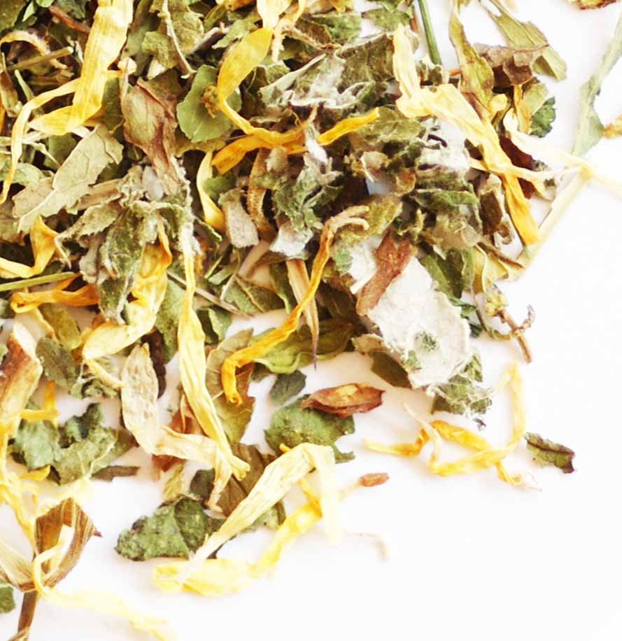 Ingrédients : Ortie, framboisier, menthe douce, trèfle rouge, racine de pissenlit et calendule.