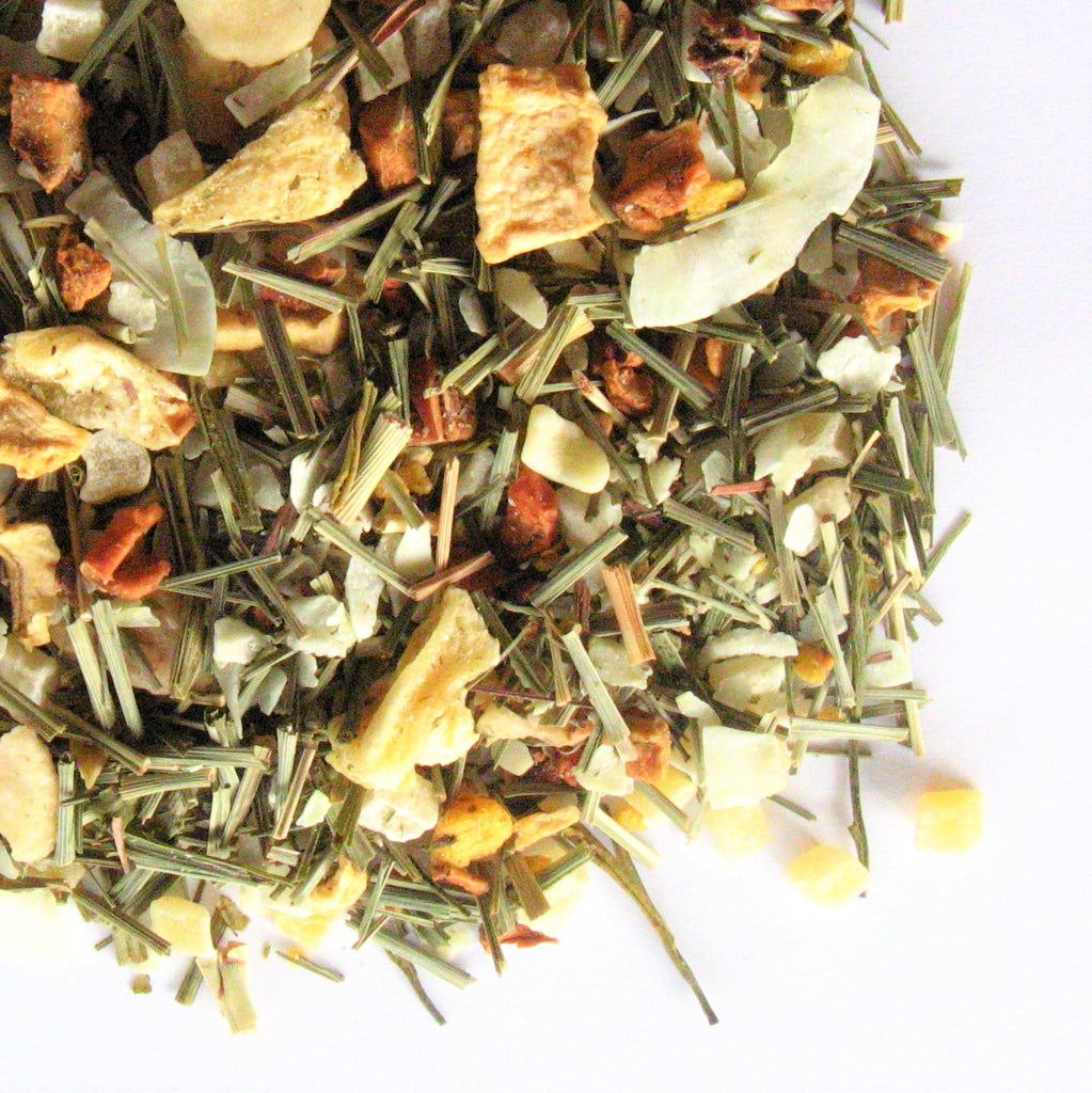 Ce délicieux mélange de citronnelle, pomme, banane, noix de coco, mangue et ananas vous enverra directement aux Caraïbes. Doux et légèrement sucré, ce mélange peut se déguster aussi bien chaud que froid!