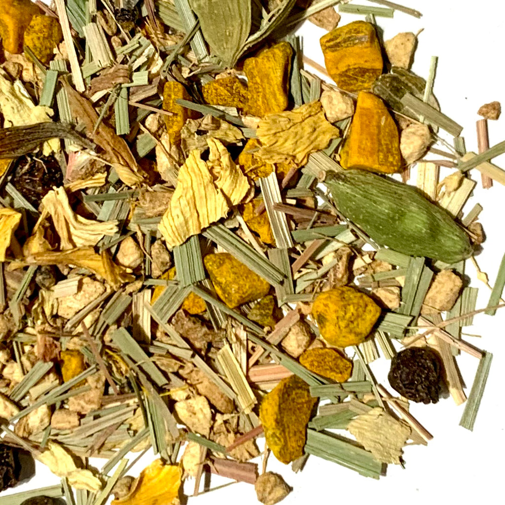 Ingrédients: Racine de curcuma, racine de gingembre, cardamome verte, poivre noir, noix de muscade, citronnelle, pétales de tournesol.