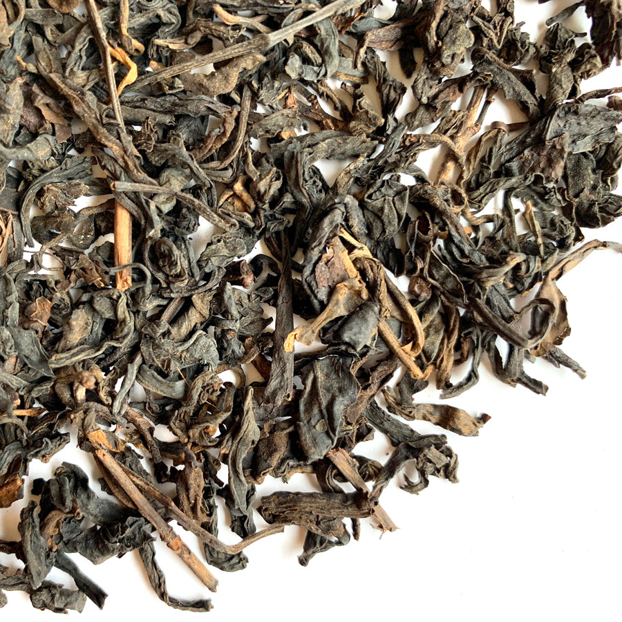 Ce relativement vieux Liu Bao, un thé post-fermenté du Guangxi apparenté aux Pu Er du Yunnan, a été vieilli dans un panier de bambou tressé depuis maintenant plus de 15 ans. Ses belles feuilles sombres dégagent des arômes de sous-bois et de betterave. Leur infusion est souple et profonde, douce et digeste, aux notes aromatiques évoquant les légumes racines, la terre de forêt, le bois usé, le silex et les champignons sauvages. Un thé précieux et rare!